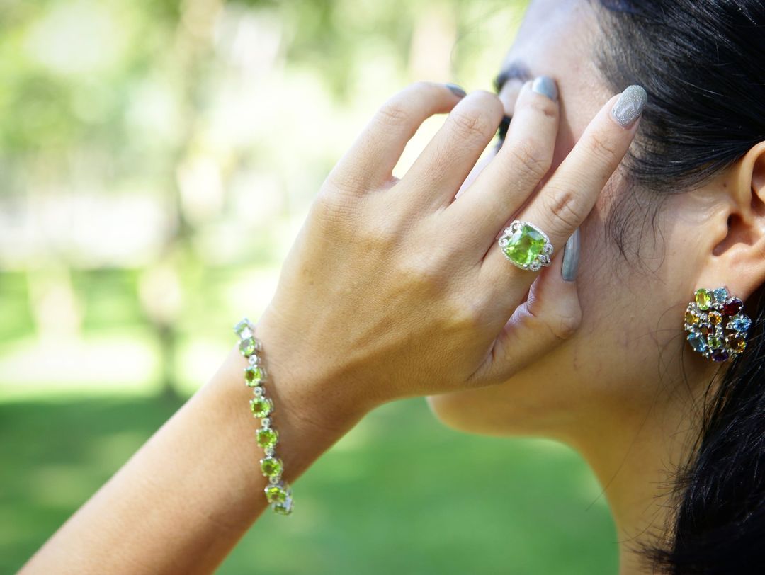 Very beautiful peridot bracelet, a classy ring and Bright Colourful Multi-gemstone Earrings! It made my day brighter than yesterday.